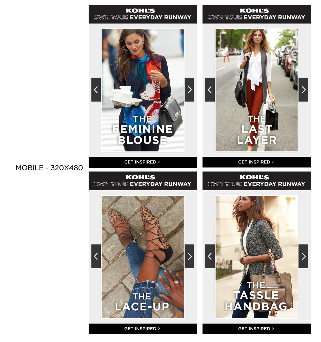 While directing the digital creative team on all site & email creative, personally executed the display creative for the extensive media digital media spend for our 2016 fall fashion campaign. Ad units were unique specs & functionality that lent a dynamic spin to the fun & trendy subject matter. Overall campaign included 40+ unique ads.